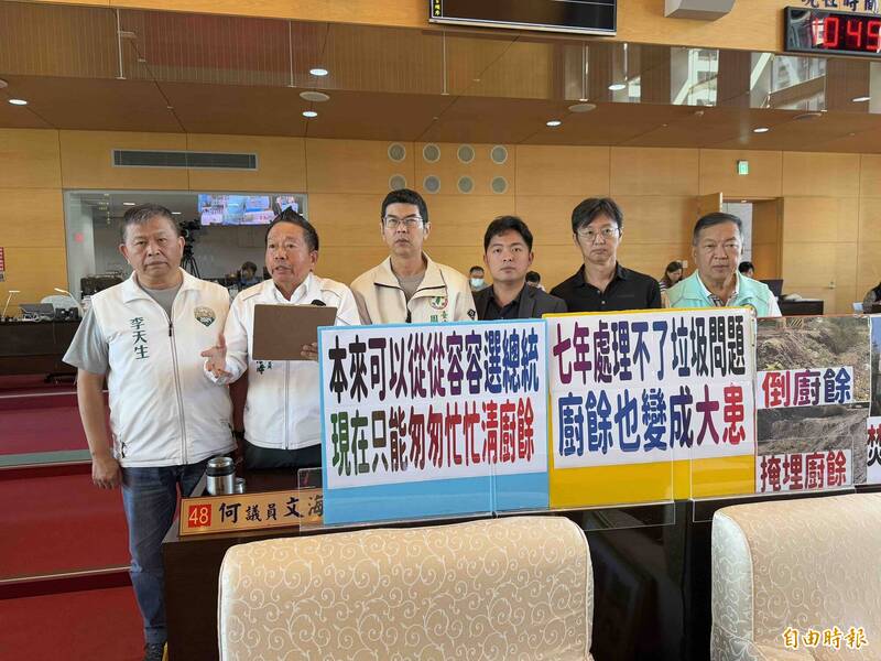 台中市議員李天生(右起)、何文海、周永鴻、蔡耀頡、江肇國、曾朝榮批評盧市府讓文山焚化廠改建延宕7年,釀成垃圾及廚餘危機。(記者蔡淑媛攝)