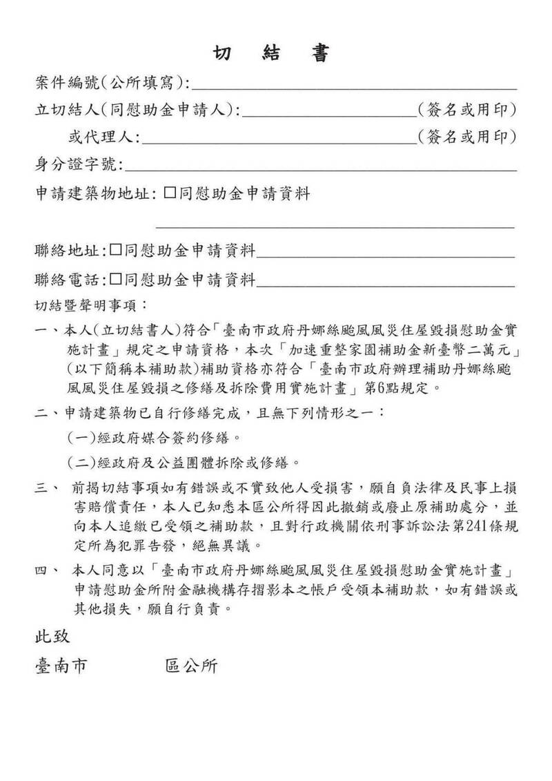 台南市今天(28日)起發放中央加發「丹娜絲風災加速重整家園補助金」2萬元,協助民眾加速家園重建,只要填妥切結書就可申請核撥入帳。