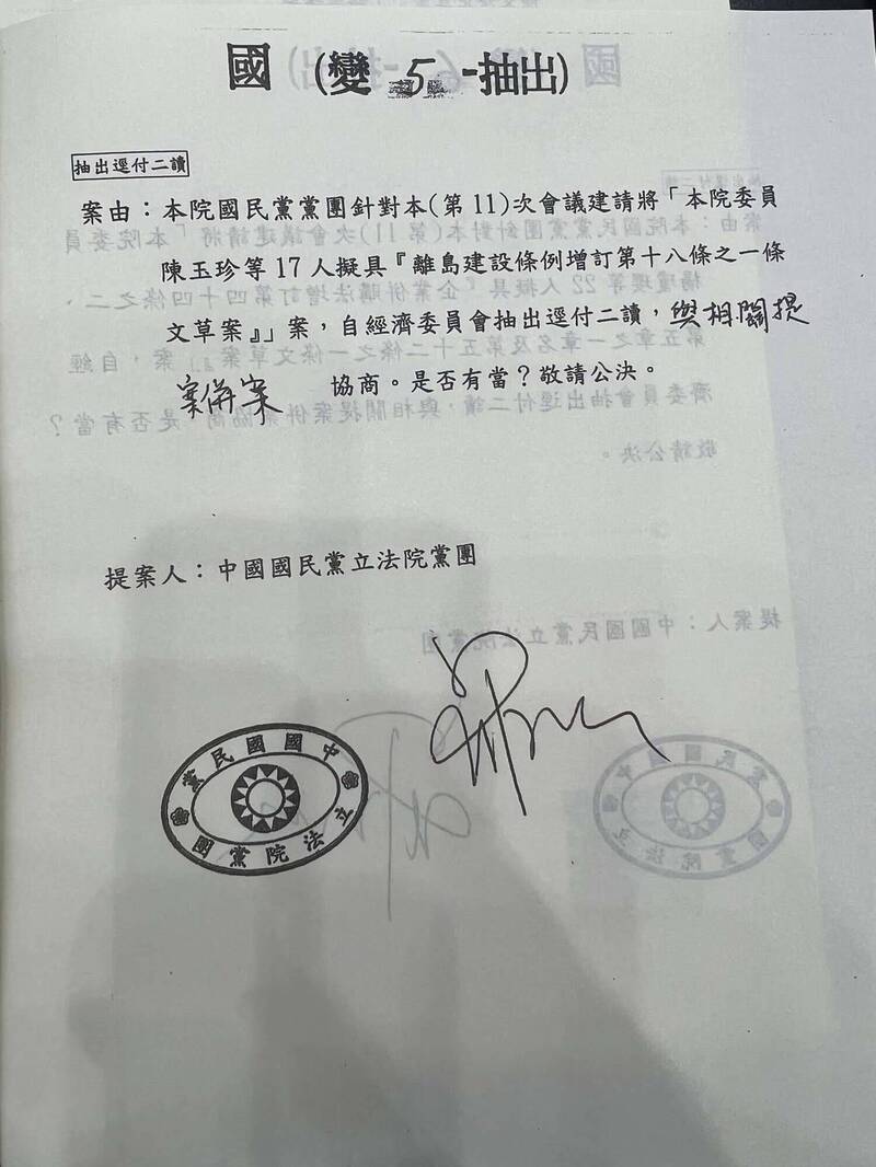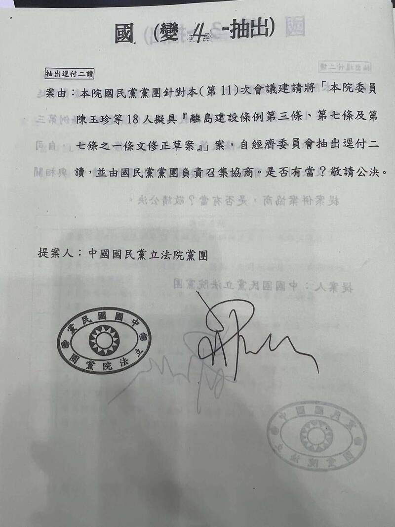 立法院國民黨團提議將「離島建設條例修正草案」、「政黨及其附隨組織不當取得財產處理條例修正草案」自委員會抽出逕付二讀。(記者謝君臨翻攝)