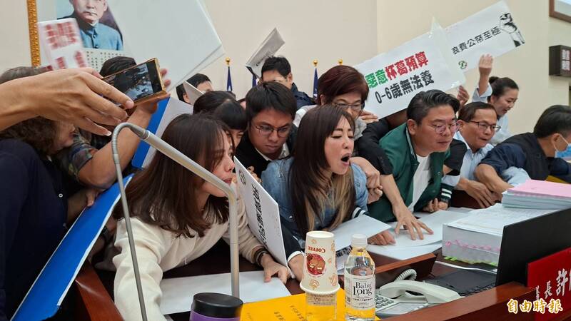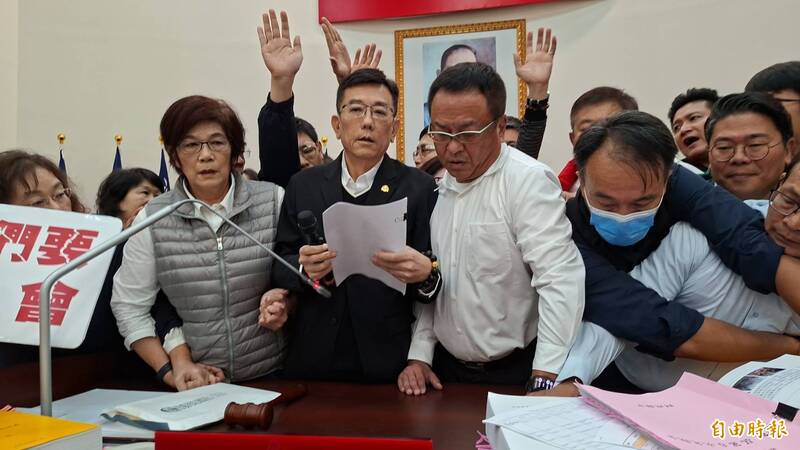新竹市議會上演藍白多數暴力大亂鬥,綠營議員占主席台4小時後,下午3點遭藍白議員強勢奪回主席台。(記者洪美秀攝)