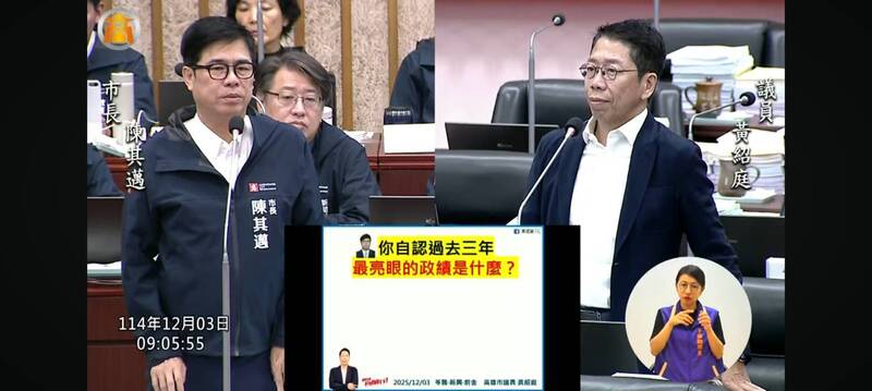 高市議員黃紹庭今質詢再次追問市長陳其邁,任內最後一年會在哪裡?陳其邁答詢說「我的答案依然是做好做滿到最後一天」。