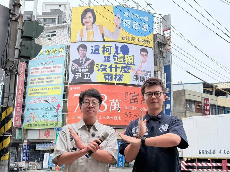 民進黨高市左楠區市議員參選人尹立、偕同現任三民區無黨籍市議員張博洋,今在國民黨市長參選人柯志恩「這柯不一樣」看板下方,加掛印有神似前高雄市長韓國瑜招牌「光頭」剪影的看板,直指「這柯跟這顆沒什麼兩樣」。