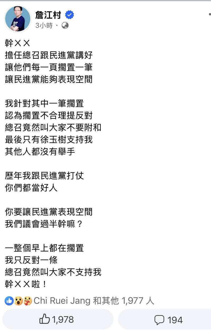 隨後詹江村在臉書PO文直接開罵「幹XX」,並說,歷年只有他跟民進黨打仗,大家都當好人,「你(指總召)要讓民進黨表現空間,國民黨議會過半幹嘛?一整個早上都在擱置,他只反對一條,總召竟然叫大家不支持他,幹ㄨㄨ啦!」