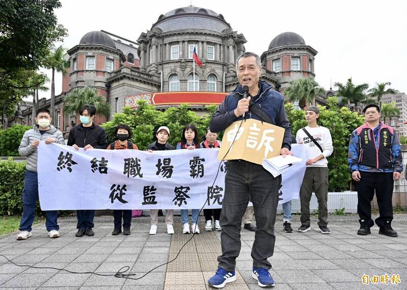 「終結職場霸凌,從監察院做起」,勞動人權協會、豐裕工會、燿華工會、台泥工會等團體今天偕同呂學民召開記者會高喊口號,呂學民說,今天帶著沉痛的心情到監院抗議,兒子在監院上班,理論上也是要維護人權的,結果卻遭受其主管、處長及主任一系列霸凌,申訴後也未獲得主管嚴肅處理,講難聽點就是「吃案」,因此到監院陳情抗議,盼獲得正視。