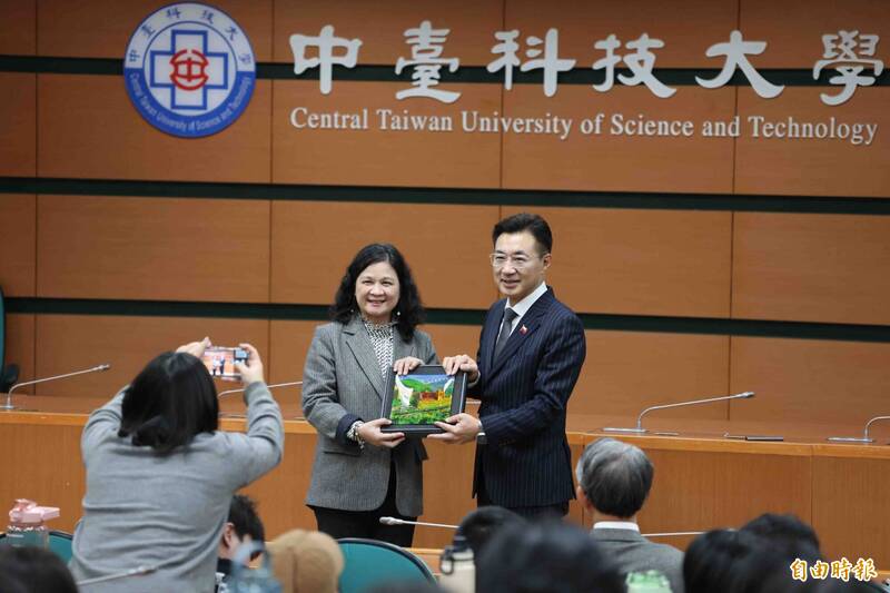 江啟臣到中台科大演講,鼓勵大家從學生時代就可以多關心公共事務,校長陳錦杏表示感謝。(記者蔡淑媛攝)