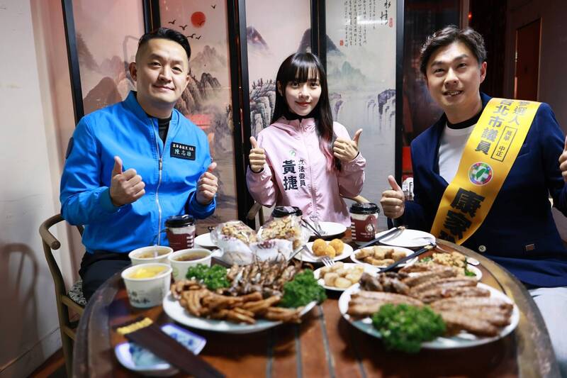 隨著黨內初選時間接近,有意參選北市中正萬華區的康家瑋(右),日前合體黃捷(中)挺進西門町大啖地方美食。(康家瑋提供)