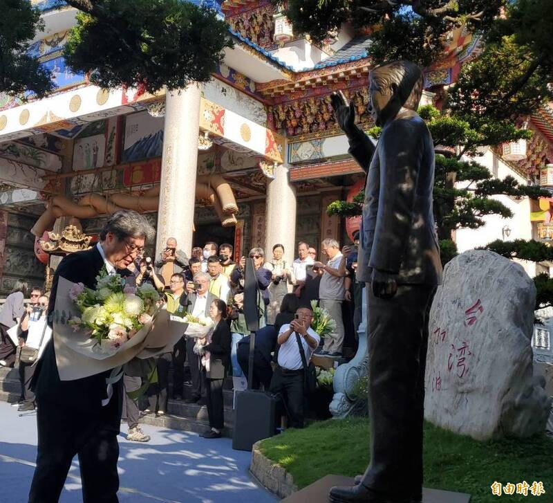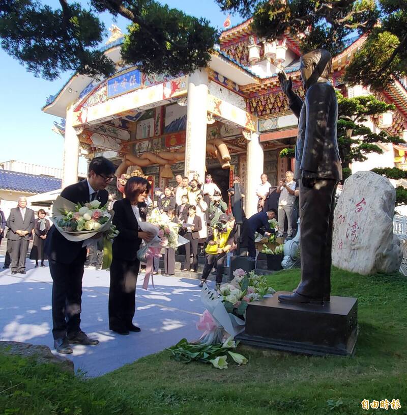 市長陳其邁與議長康裕成也向已故前日本首相安倍晉三銅像獻花致意。(記者陳文嬋攝)