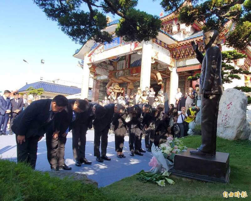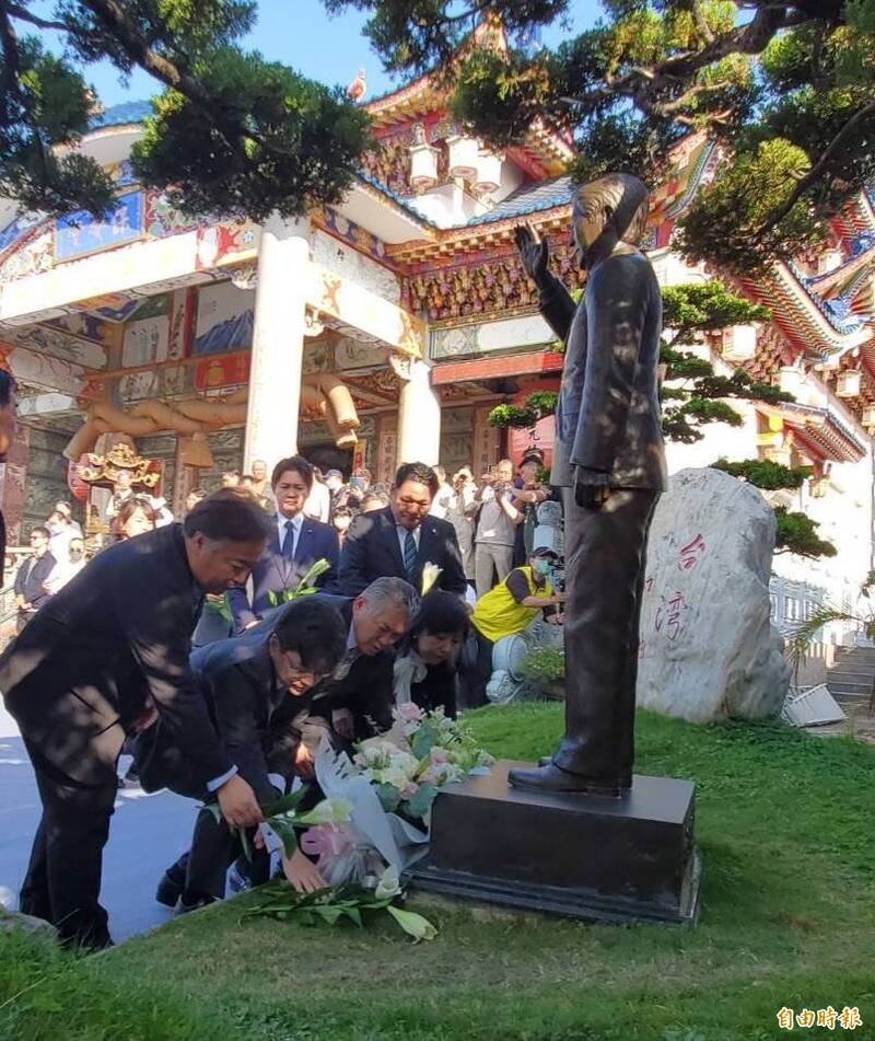 日本自民黨幹事長代行萩生田光一率眾議員向已故前日本首相安倍晉三銅像獻花致意。(記者陳文嬋攝)