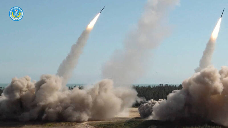 共軍東部戰區30日公布實彈射擊畫面,多枚長程火箭齊射攻擊台灣南部海域。(路透)
