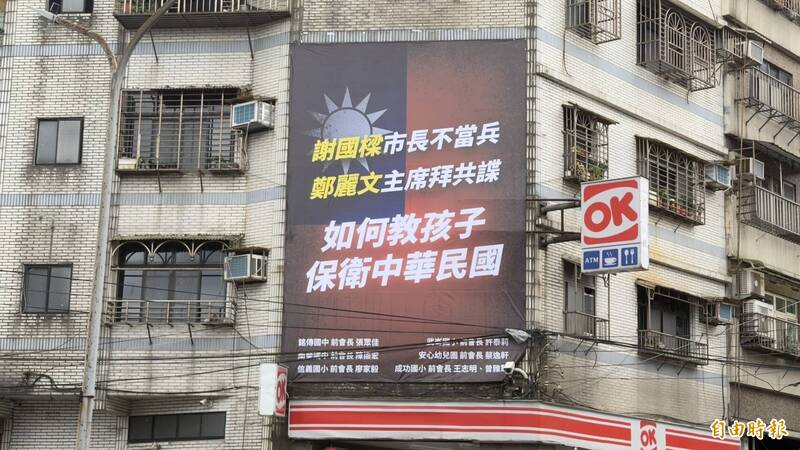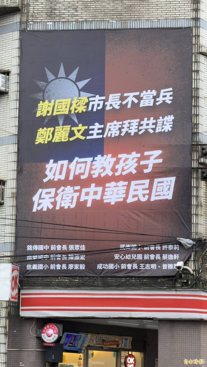 基隆市區出現大型看板,家長署名質疑謝國樑和鄭麗文的愛國立場。(記者盧賢秀攝)
