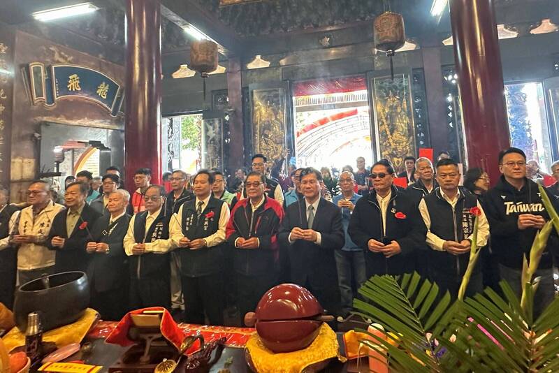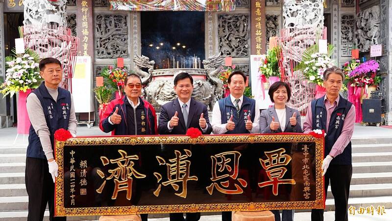 南興宮新舊主委交接,林佳龍、吳世瑋及廟方共同參拜媽祖。(民政局提供)