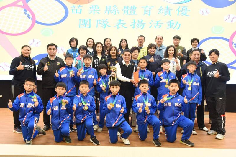 苗栗縣苑裡國小獲永信杯排球賽金牌,縣長鍾東錦(中排右4)頒發獎勵金。(苗栗縣政府提供)