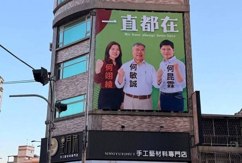 前台中市議員何敏誠掛上自己兒子及女兒的競選看板,暗示著年底市議員選舉不缺席。(記者蘇金鳳翻攝)