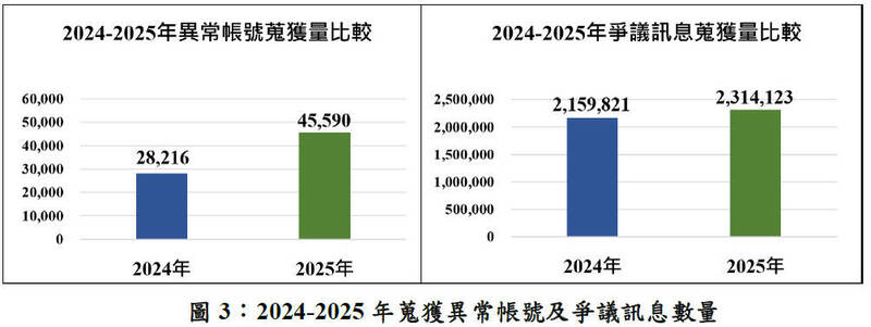 國安局指出,國安情報團隊去年共查報逾4.5萬組異常帳號,較2024年增加1.7萬餘組,並蒐獲逾231.4萬則爭議訊息,全年通報政府相關部門計3200餘則爭議訊息,以利政府即時應處中共對我認知戰操作。報告指出,去年爭議訊息搜獲量為231萬4123則,前年為215萬9821則。