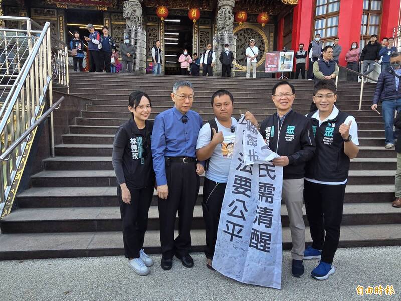 柯粉今帶布條給柯文哲(左2)簽名聲援。(記者王善嬿攝)