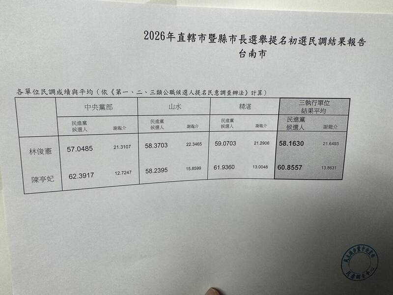 民進黨台南市長初選民調公布。(記者洪瑞琴翻攝)