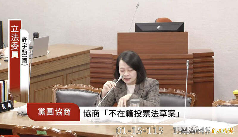 立法院朝野黨團今天下午協商民眾黨黨團擬具的「不在籍投票法草案」,國民黨團首席副書記長許宇甄表示,國民黨團認為現階段的社會共識仍有不足,建議繼續協商、凝聚共識後再推動。(記者李文馨翻攝)