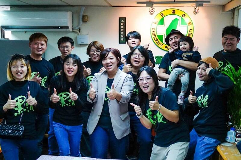 巫宛萍(前左3)14日在⼀群年輕支持者陪同下,到民進黨彰化縣黨部領表登記參選溪州鄉長。(巫宛萍提供)