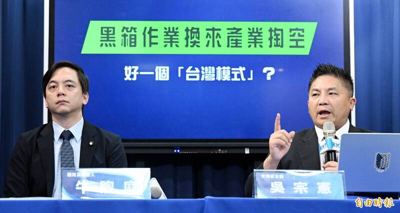 國民黨文傳會主委吳宗憲(右)、發言人牛煦庭(左)今舉行「黑箱作業換來產業掏空,好一個『台灣模式』?」記者會。(記者廖振輝攝)