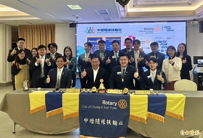 民進黨立法委員王義川(前排中)出席中壢隨緣扶輪社例會。(記者周敏鴻攝)