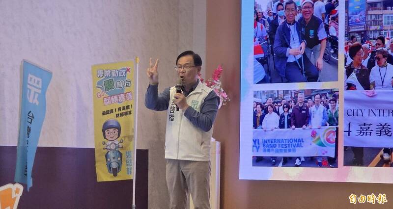今天造勢活動在晶饌會館舉行,民眾黨現任立委林國成等人及候任立委王安祥與前立委蔡壁如等人到場力挺張啓楷,嘉市軍公教退休關懷協會成員與多位嘉市藍營里長也到場助陣。