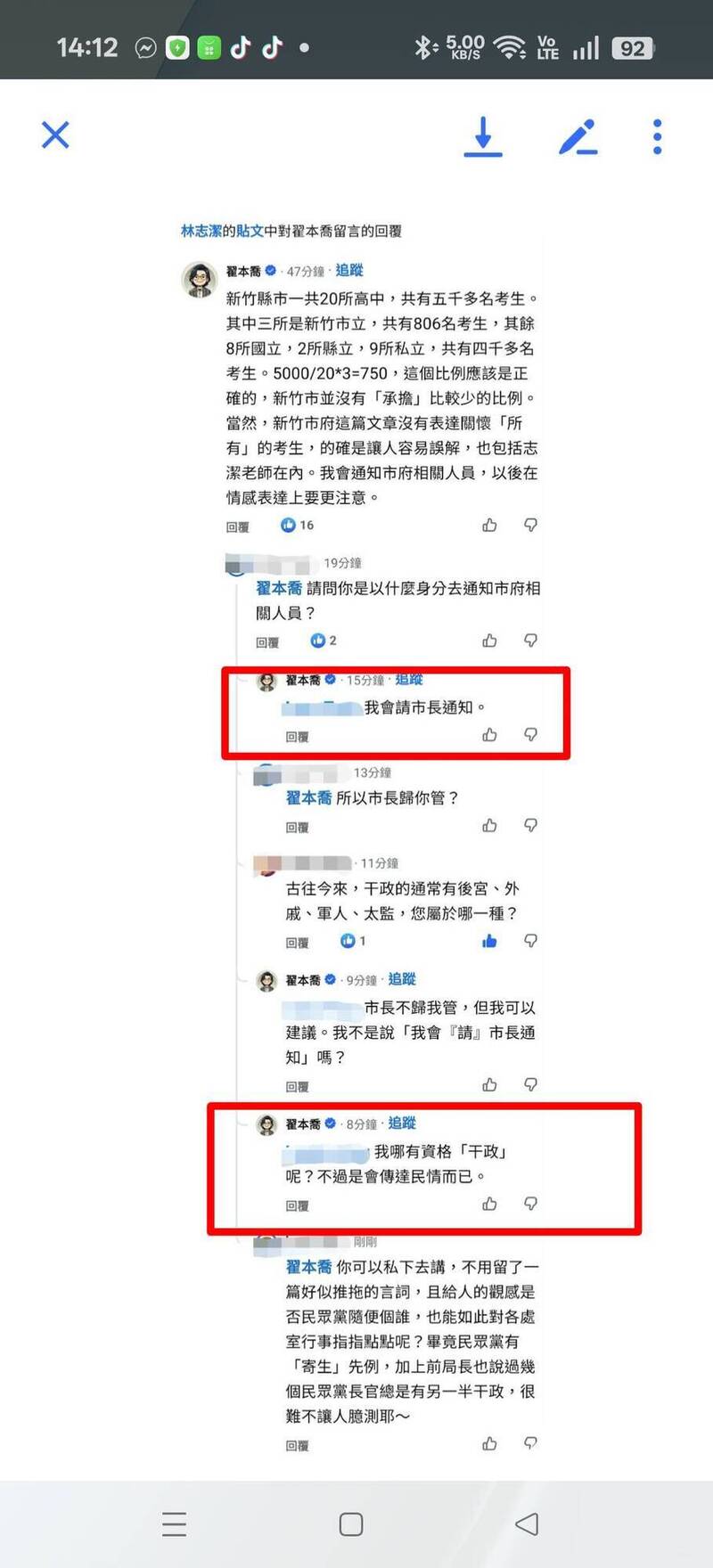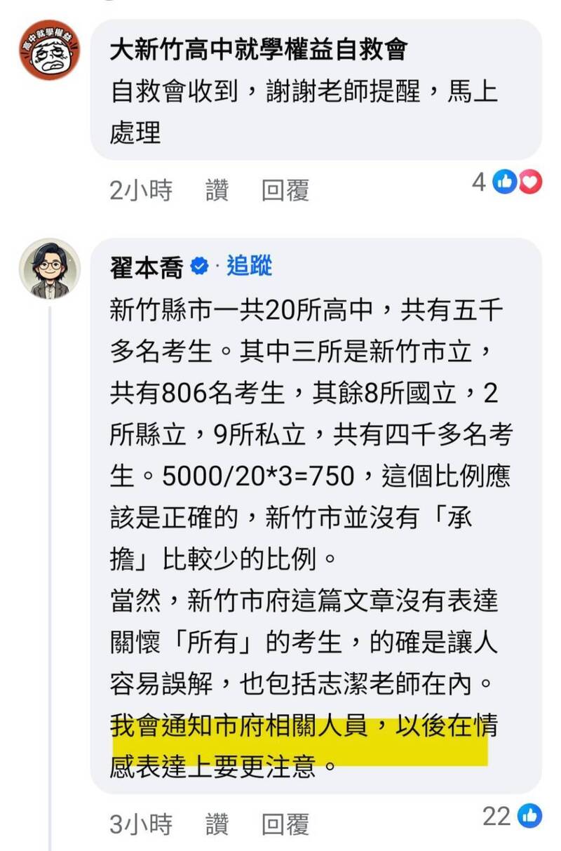 新竹市府教育處粉專今天發文關心市立3所高中806名考生的貼文,引發市府只關心市立高中考生,挨批忽視新竹市其他5千多名考生。沒想到民眾黨新竹黨部副主委翟本喬也留言稱「我會通知市府相關人員,以後在情感上表達要注意」,結果引來網友留言稱翟本喬竟可介入竹市府市政,引來「干政」質疑,翟本喬急忙回應他無資格「干政」。對此,竹市前文化局長錢康明大酸翟本喬提到敏感的「干政」字眼,高虹安會甩嗎?