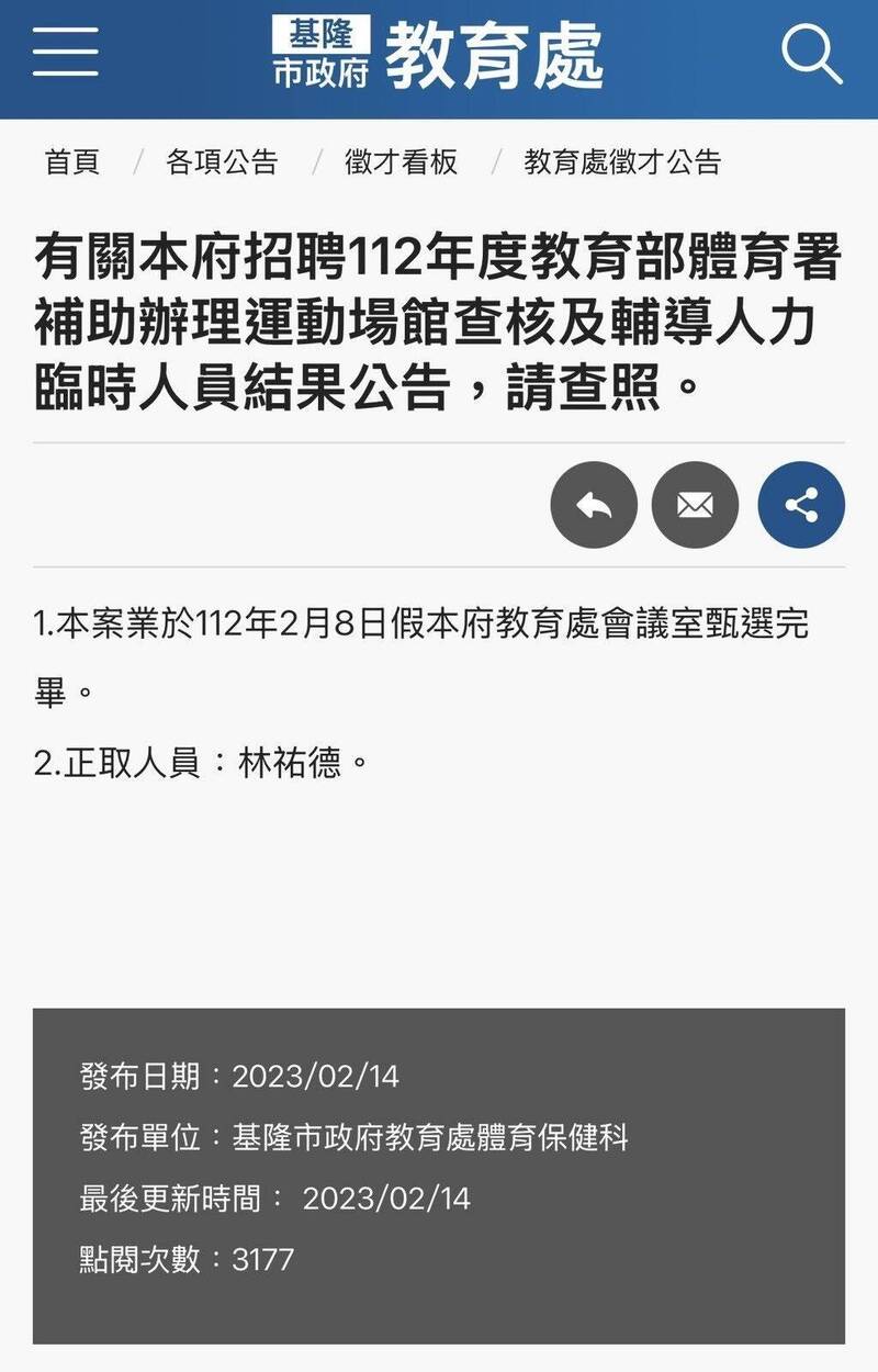 基隆市政府教育處公告林祐德為「112年度教育部體育署補助辦理運動場館查核及輔導人力臨時人員」正取招聘人員。(翻攝自基隆市政府教育處網站)