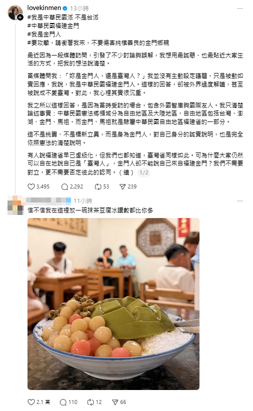 國民黨立委陳玉珍日前被爆料曾對去拜訪她的美國智庫人士說「我不擔心中共打過來,因為我本來就不是台灣人」,陳玉珍沒有想辯解,19日還在社群重申自己不是台灣人,「我是福建金門人」。結果有網友隨便在底下放了一張「抹茶豆腐冰」就「打趴」陳玉珍,讚數完全輾壓。