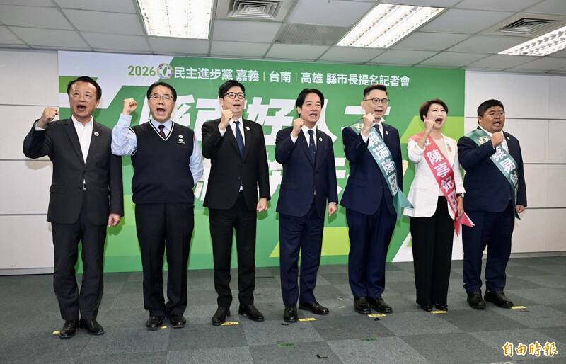 民進黨中執會今天下午通過提名高雄市長參選人賴瑞隆、台南市長參選人陳亭妃、嘉義縣長參選人蔡易餘,會後召開提名記者會,由黨主席賴清德親自公布並為被提名人繫上競選背帶。