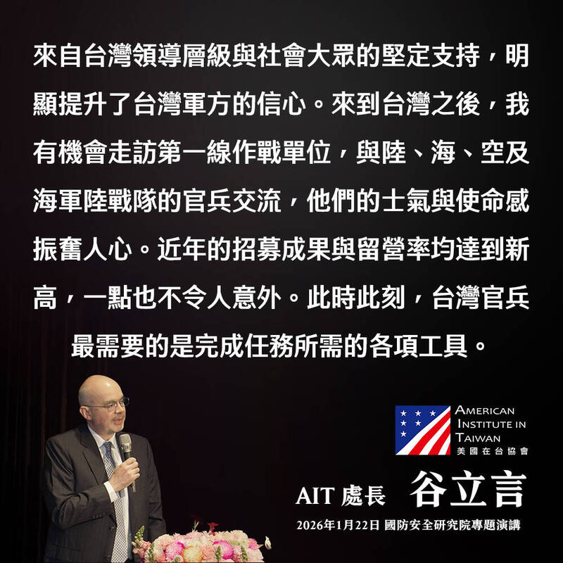 AIT臉書粉專今日下午連續發文PO出圖卡,強調谷立言在國防安全研究院專題演講中的發言,其中一篇貼文中的圖卡提到,谷立言來台後曾與第一線陸、海、空官兵交流,他們的士氣與使命感振奮人心,而此時此刻,台灣官兵最需要的是完成任務所需的各項工具。