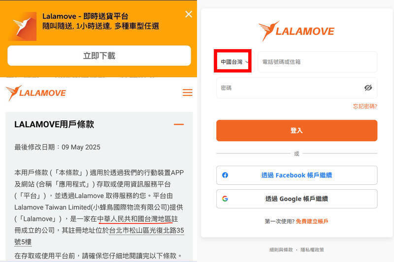Lalamove官網用戶條款及會員註冊等處,將我國標示為「中國台灣」引發網友不滿。(圖擷取自Threads和Lalamove官網)
