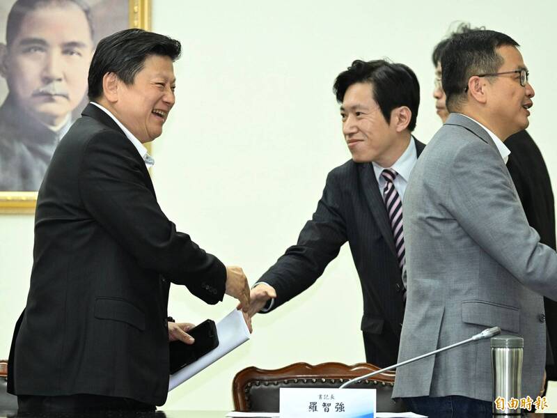行政院秘書長張惇涵偕同中選會被提名人拜會立法院國民黨團,張惇涵會後與國民黨團總召傅崐萁握手致意。(記者陳逸寬攝)