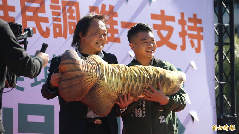 立委王世堅送大魚娃娃,盼吳昇翰「遊刃有餘」通過民調初選。(記者黃政嘉攝)