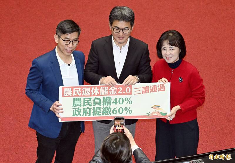 行政院會去年12月通過「農民退休儲金條例第2條及第7條條文修正草案」,調整農民與主管機關每月提繳金額的比例,將農民負擔比例從現行的5成調降為4成。朝野立委亦提出25個相關修法版本,盼減輕農民經濟負擔並提升農民參與意願。今天立法院會處理時,在場立委皆未提出異議,全案順利三讀通過。