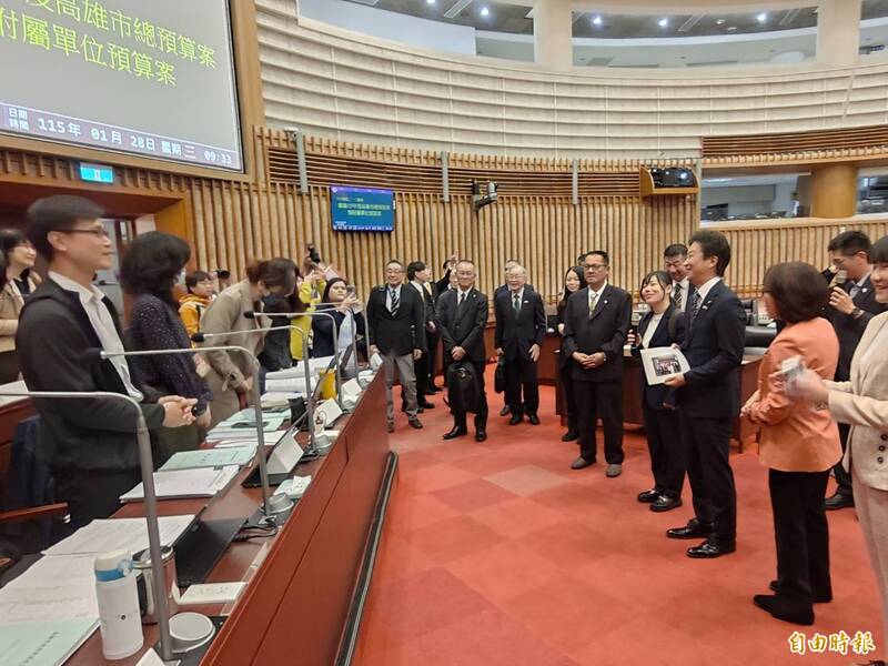 日本富山縣氷見市長菊地正寬今首度率團拜訪高市議會,議長康裕成引領訪客參訪議事廳,與備詢的新聞局官員互動。(記者王榮祥攝)