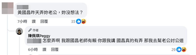 而今天陳佩琪在臉書發文,繼續罵民進黨政府政治打壓柯文哲,底下有不少網友提起昨天的事,「黃國昌昨天弄妳老公,妳沒想法?」、「黃國昌弄了你們夫妻才能當主席,你們還把他當神拜」、「昨天國昌老師的眼神真靈動」、「國昌老師昨天這麼明顯你還沒有警覺嗎」。沒想到竟然真的釣出陳佩琪親回:「怎麼弄啊? 我跟國昌老師有賴(Line),你跟我講,國昌真的有弄,那我去幫老公討公道!」