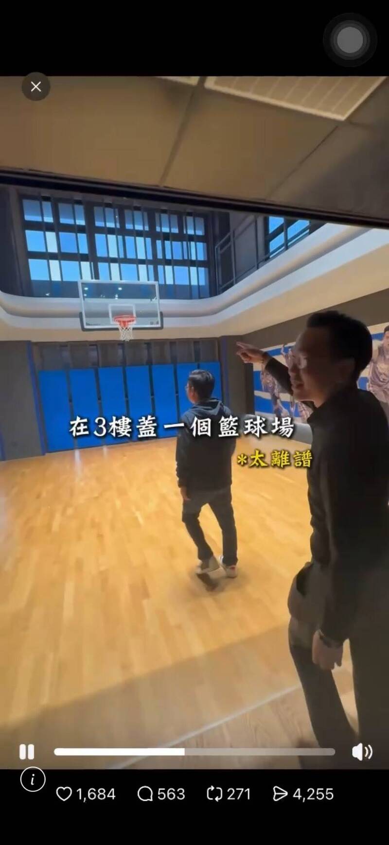 彰化議長謝典霖帶網紅開箱自家豪宅內部設施,3、4樓有挑高的室內籃球場。(圖擷取網紅億百豪森影片)