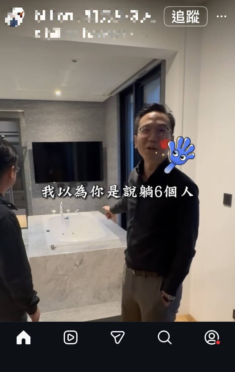 謝典霖溪州鄉豪宅內設施豪華,浴沐間有超大浴缺及電視。(圖擷取網紅億百豪森影片)