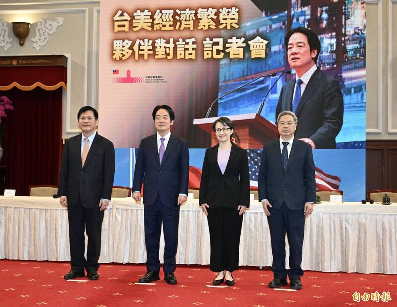 第6屆台美「經濟繁榮夥伴對話(EPPD)」日前於華府圓滿落幕。總統賴清德(左二)於3日召開記者會,揭示台美未來合作的3大戰略方向「經濟安全、創新經濟、繁榮未來」。副總統蕭美琴(右二)、外交部長林佳龍(左一)、經濟部長龔明鑫(右一)等人出席記者會。(記者羅沛德攝)