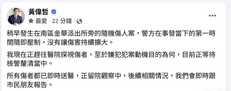 南區隨機傷人案,台南市長黃偉哲發文關切。(擷自臉書)