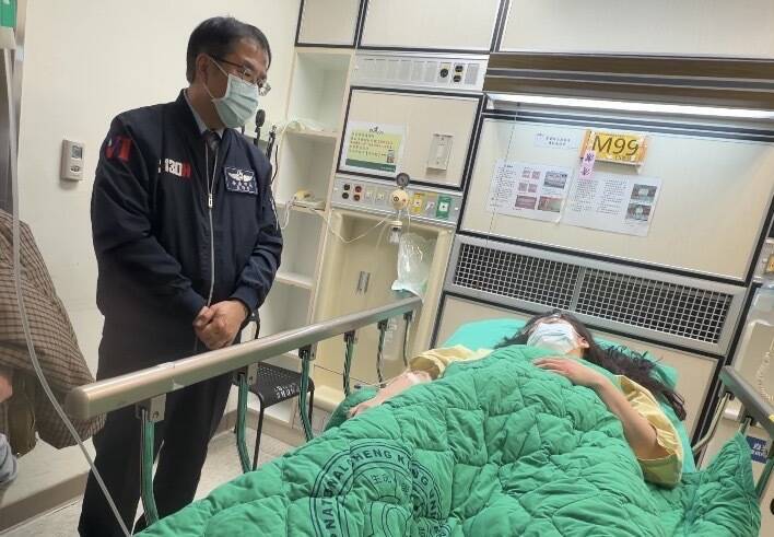 台南市長黃偉哲到成大醫院慰問背部受傷的年輕女子,她向市長描述案發狀況。(台南市府提供)