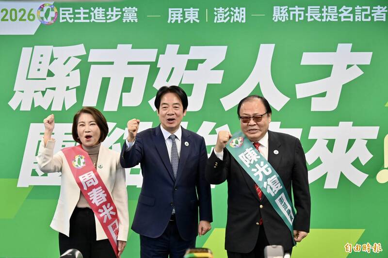 民進黨主席賴清德主持縣市長提名記者會,推薦屏東縣長周春米(左)、澎湖縣長陳光復(右)競選連任。(記者叢昌瑾攝)