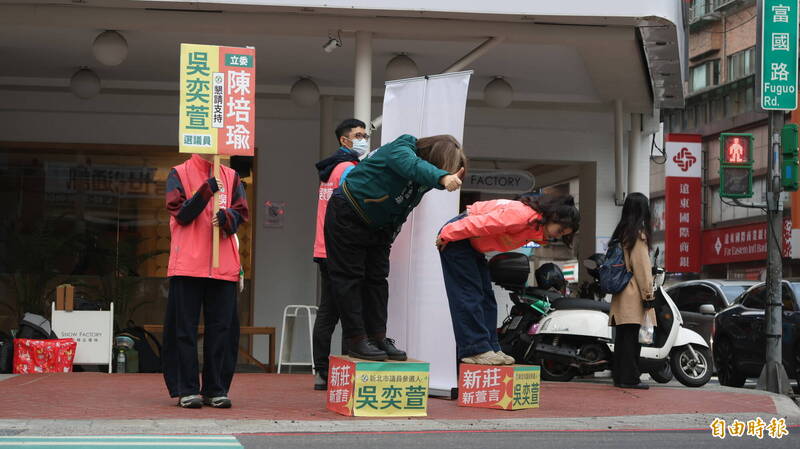 立法院民進黨團書記長陳培瑜(綠色外套者)今天早上陪同新北市議員新莊區初選參選人吳奕萱在路口九十度鞠躬拜票。(記者黃政嘉攝)