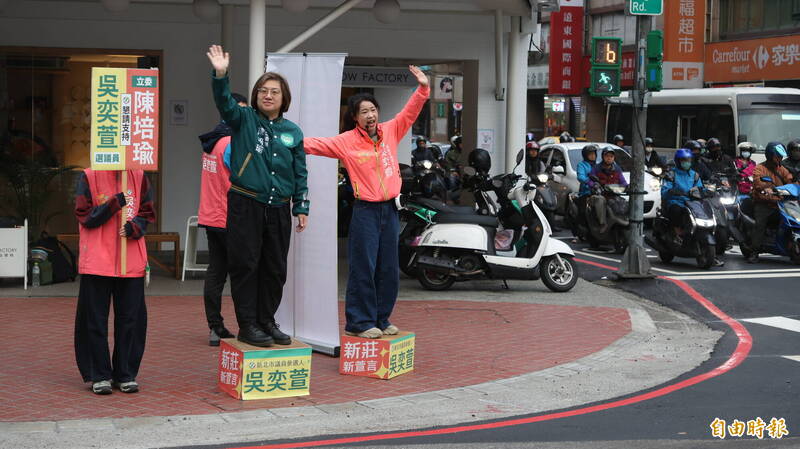民進黨立院黨團書記長陳培瑜(左)今陪同民進黨新北市議員新莊區初選參選人吳奕萱(右)站路口拜票。(記者黃政嘉攝)