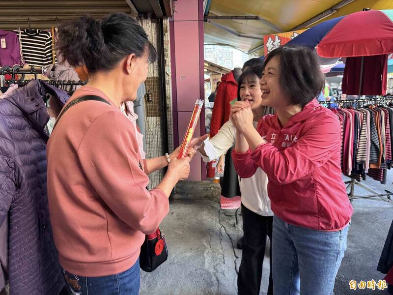 何欣純到北屯市場拜票、發春聯。(記者蔡淑媛攝)