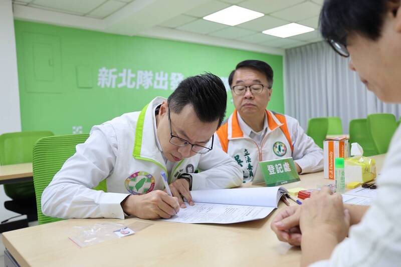 現任民進黨籍新北市議員翁震州今在立委吳秉叡陪同下,前往新北市黨部進行初選登記,正式投入連任之路。(圖由新北市議員翁震州提供)