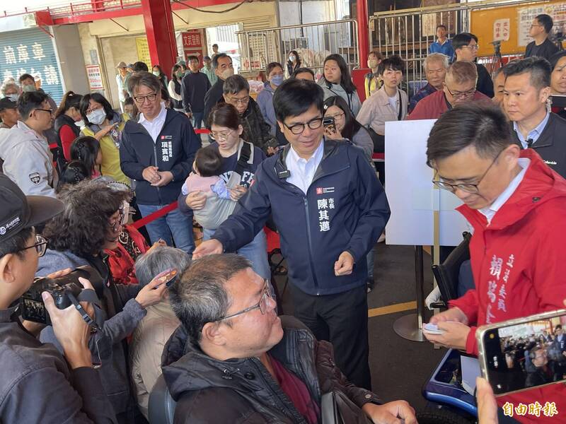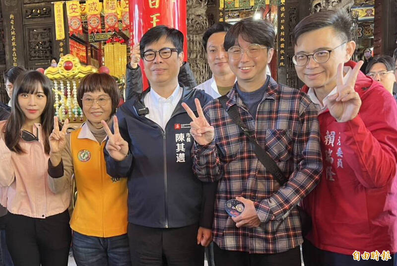 高雄市長陳其邁循往年,前往各廟宇走春參拜,同時發送小紅包、春聯。(記者黃良傑攝)