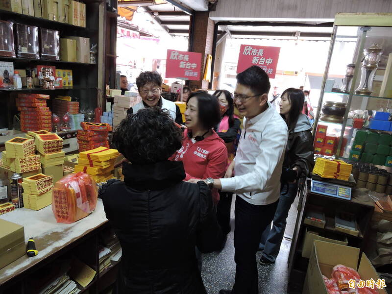 民進黨中市長參選人何欣純(中)在市議員江肇國(右)與黃守達(左)的陪同下至向上市場拜票。(記者蘇金鳳攝)