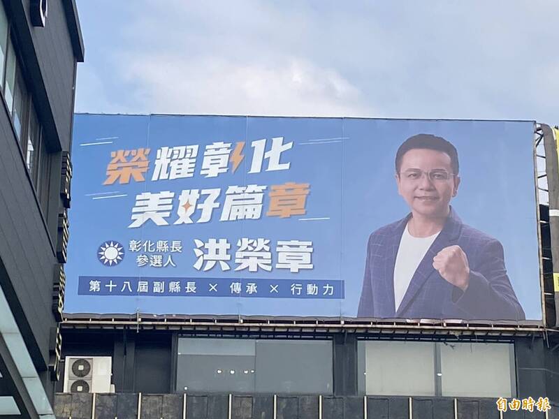 曾任副縣長的彰化工策會總幹事洪榮章,爭取提名的競選看板高掛彰化市區。(記者張聰秋攝)