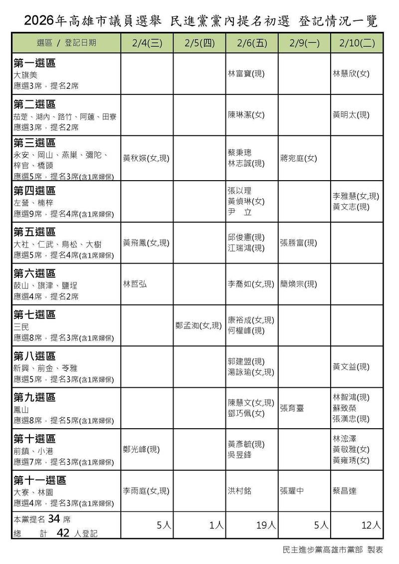 民進黨高市議員黨內初選登記今下午5點截止。市黨部統計5天共有42人報名,預計提名34人,11選區中有6個選區超額,會先啟動協調機制後再做民調。